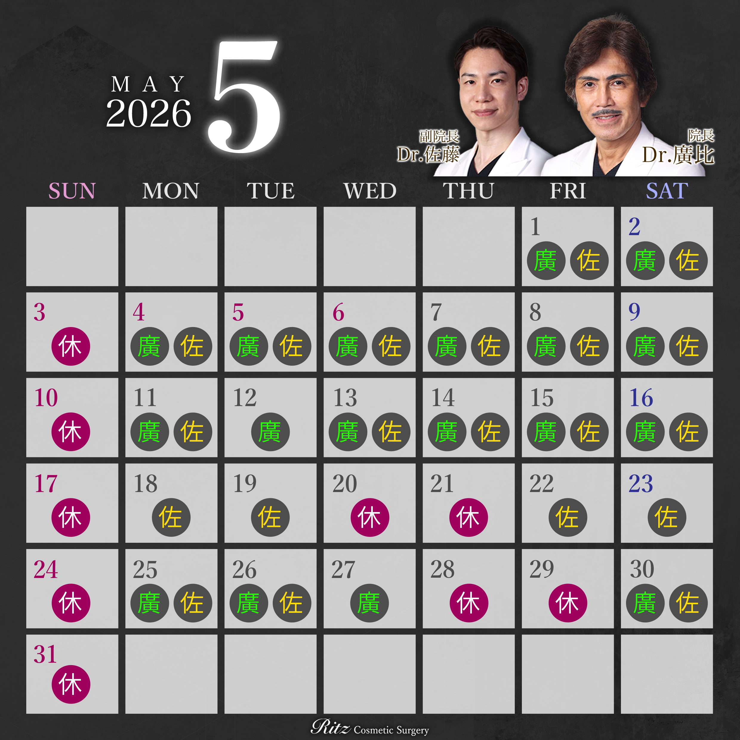5月の診療日カレンダーをアップしました | 美容整形手術ならリッツ美容外科東京院